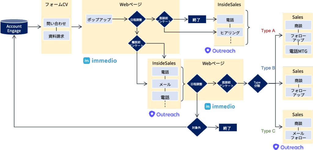 ───営業活動における理想的な行動習慣を型化し、Outreachで実装・再現されている点は、まさに最先端の取り組みですね。御社ではOutreachだけでなく、immedioやSalesforceといった複数のセールステクノロジーを導入されていますが、どのように役割分担して活用されているのでしょうか。